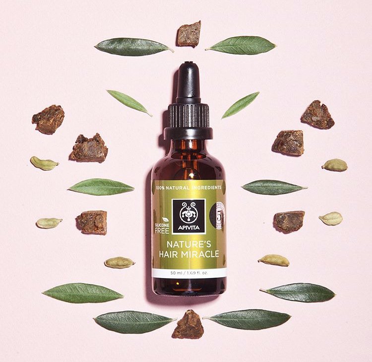 4 Προτείνω το λάδι της Apivita Nature's Hair Miracle, ένα λάδι με 100% φυσικά συστατικά που δυναμώνει και τονώνει τα μαλλιά.