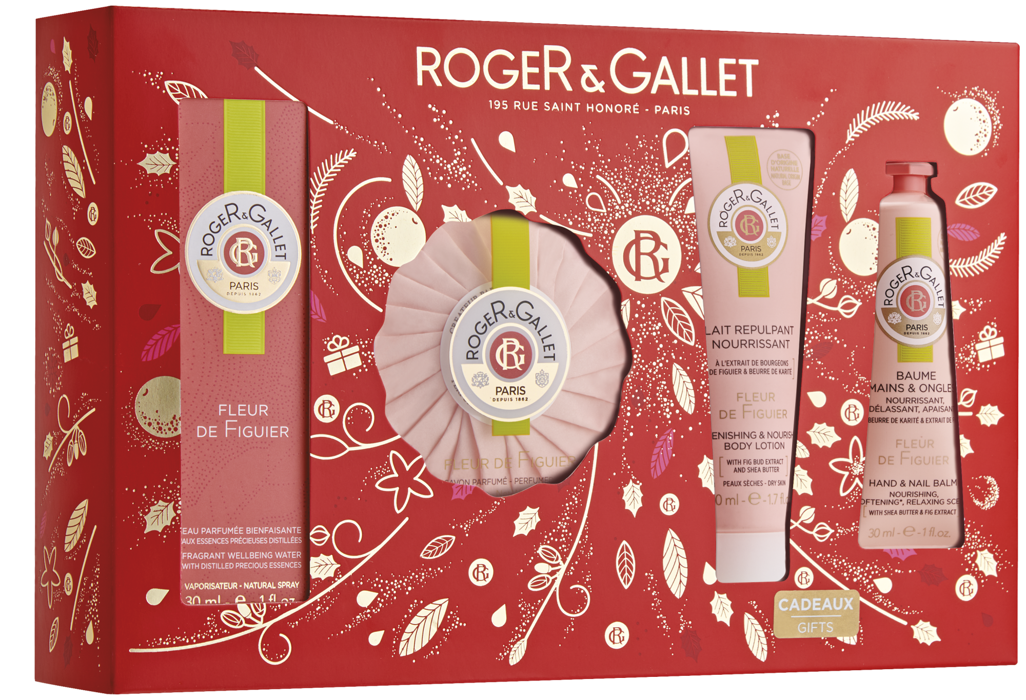 1 Το σετ Fleur de Figuier περιλαμβάνει το ομώνυμο άρωμα σε 30 ml, το αντίστοιχο σαπούνι, την κρέμα των χεριών και το γαλάκτωμα σώματος σε ειδική συσκευασία.